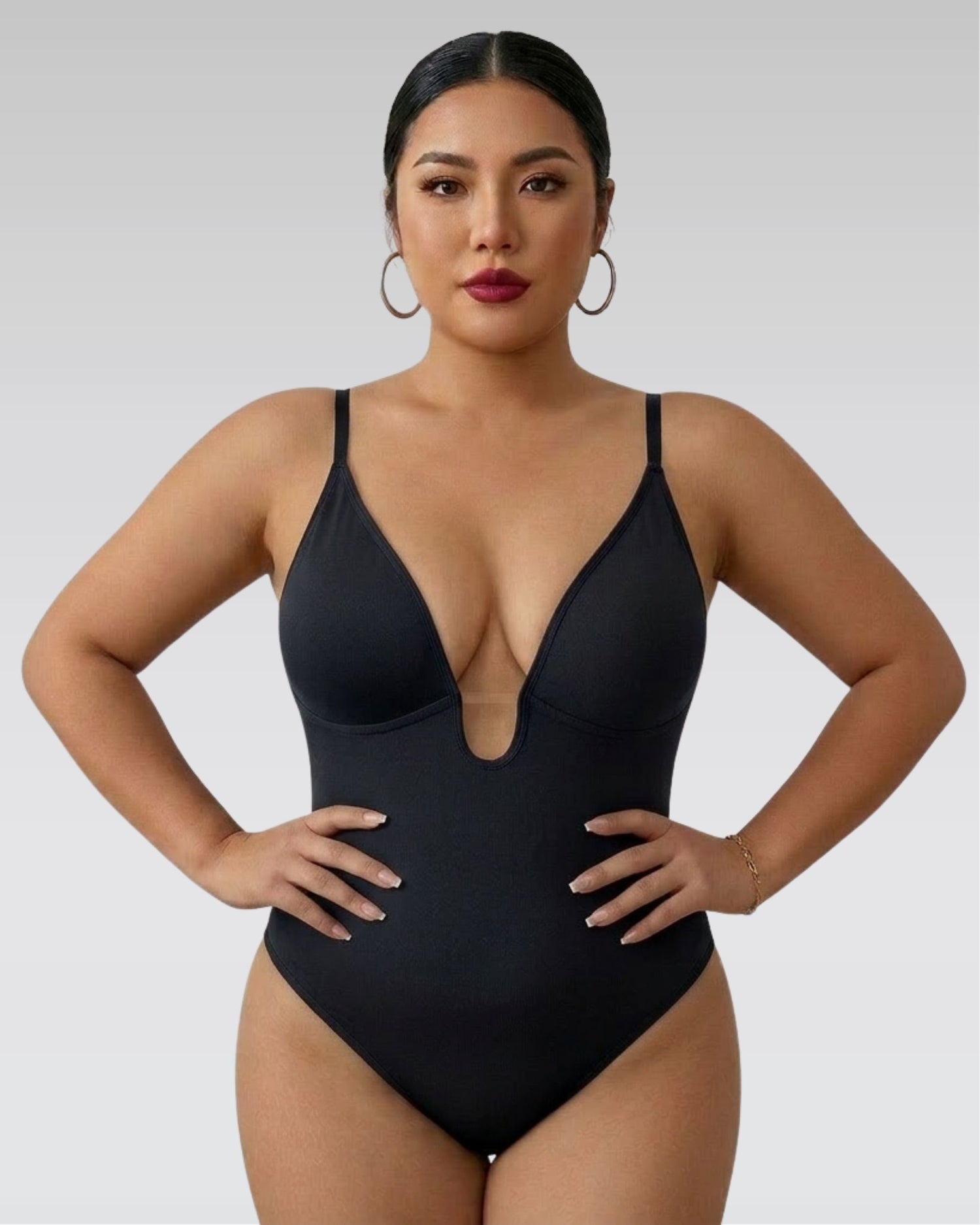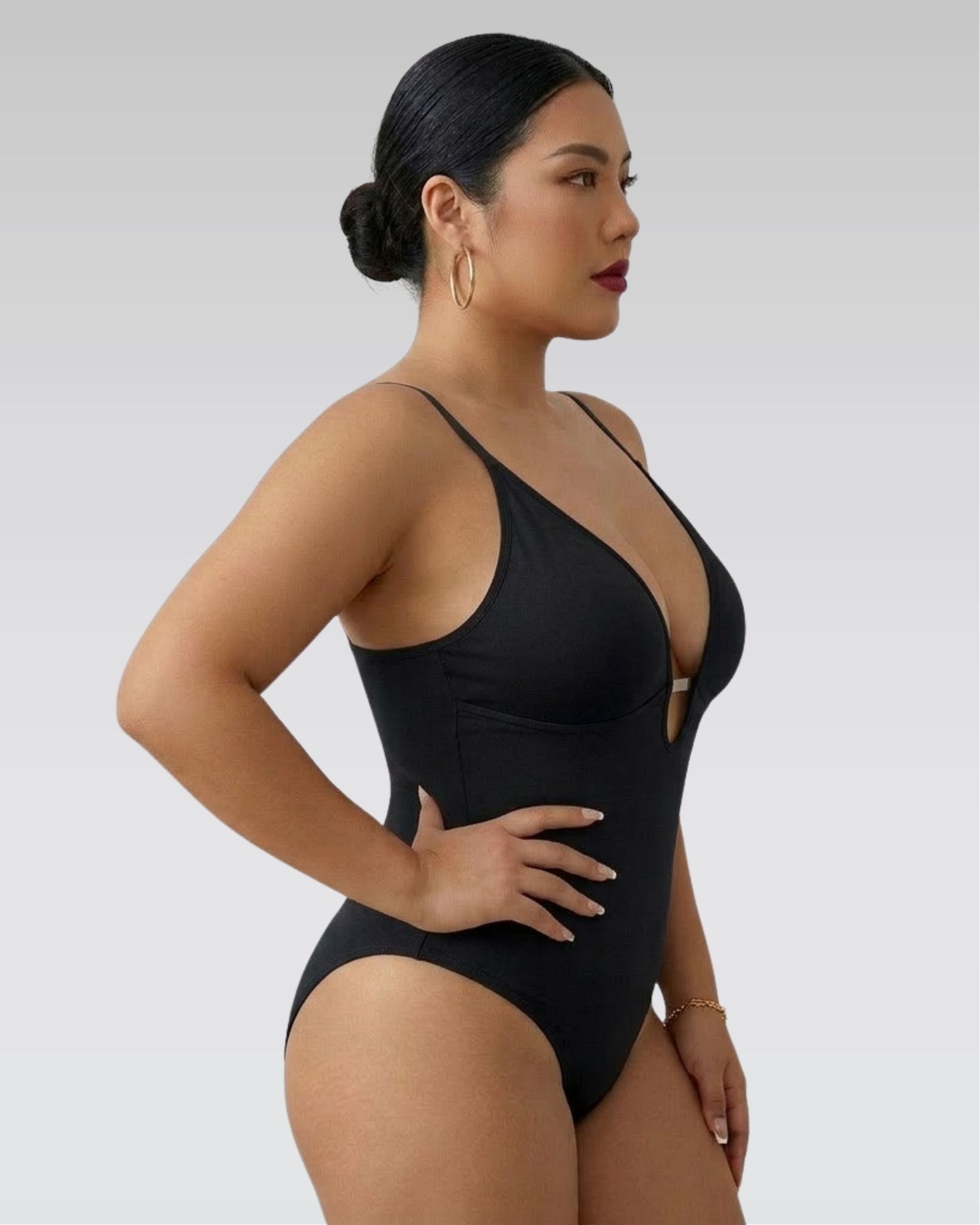 • Deep contour neckline: enhances and shapes the bust naturally
