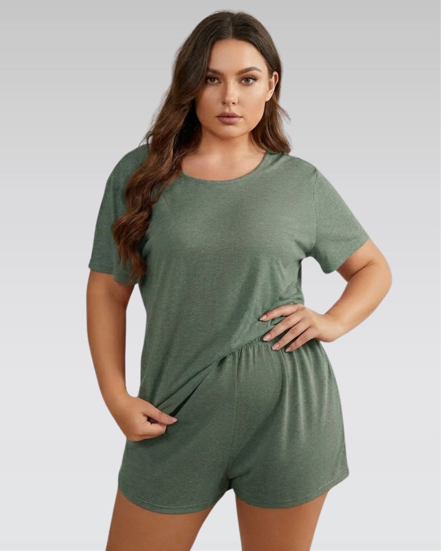 - Avslappet, ledig passform: romslig t-skjorte + matchende shorts designet for å føles behagelig og flatterende.