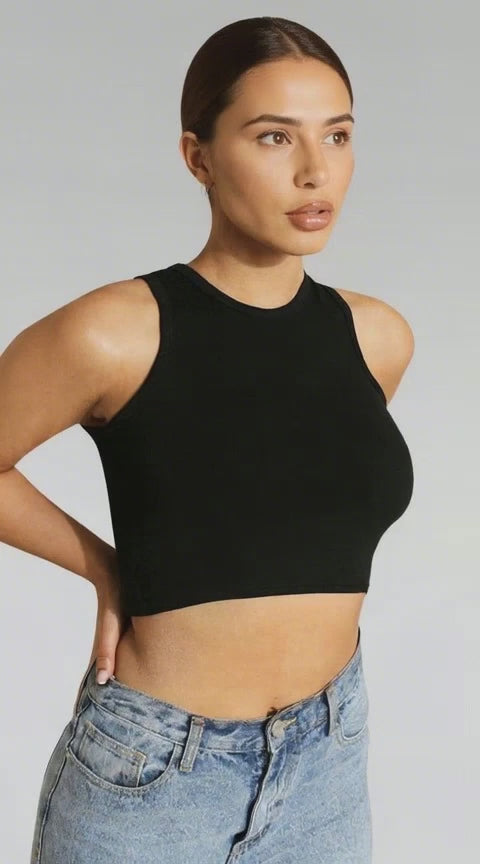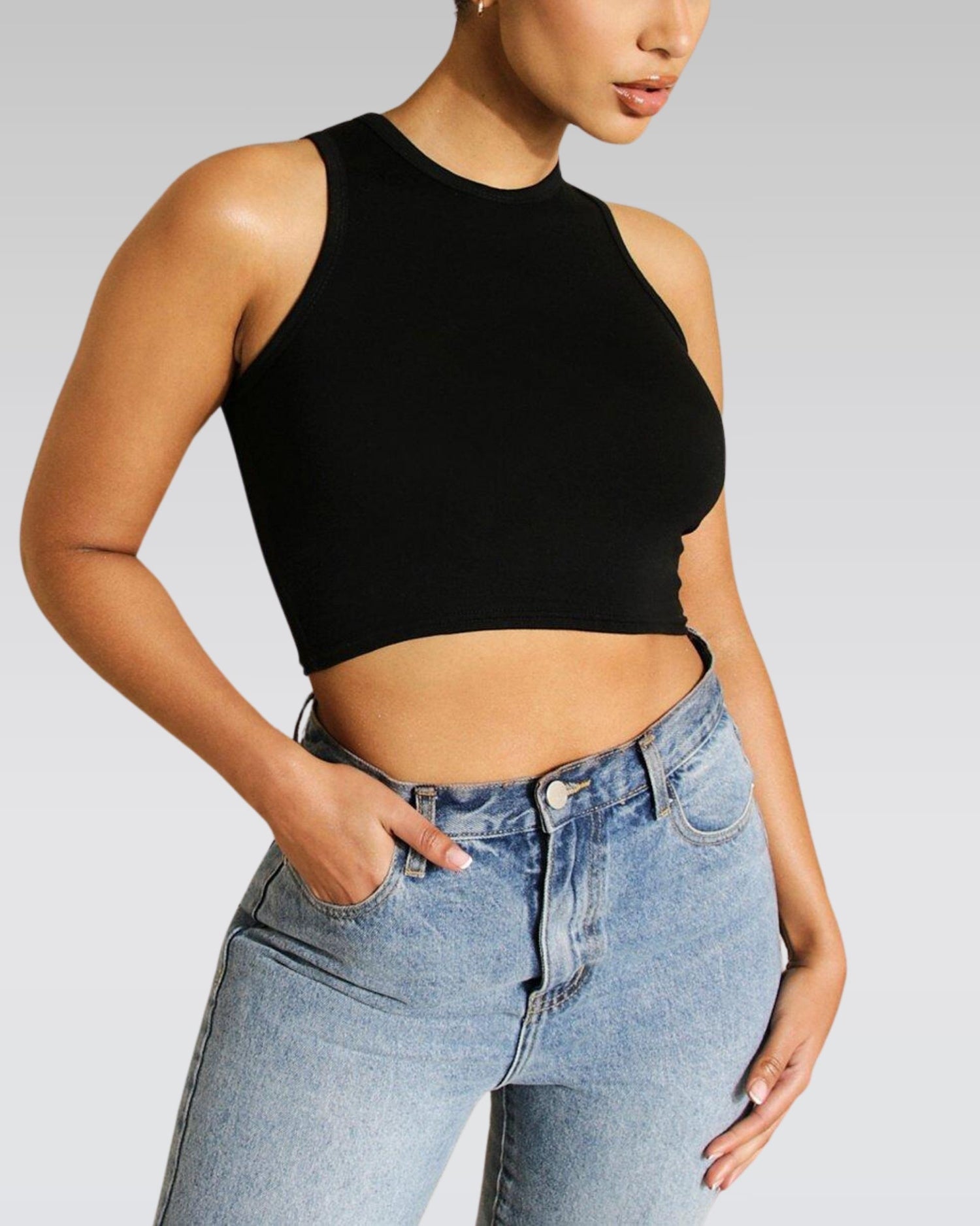- Clean round neckline + sleeveless cut for an easy, flattering fit and full range of motion.