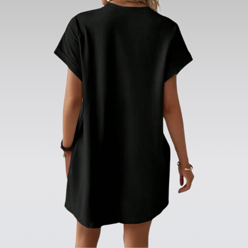 Elevate your style with this classic round neck dress, perfect for a sophisticated and comfortable look. The round neckline adds a touch of elegance, while the short sleeves provide excellent airflow, ideal for warm days. Made from lightweight and breathable fabric, this dress keeps you cool and stylish, even on the hottest summer days. The slim fit gently highlights your silhouette, offering a modern and elegant appearance without sacrificing comfort.